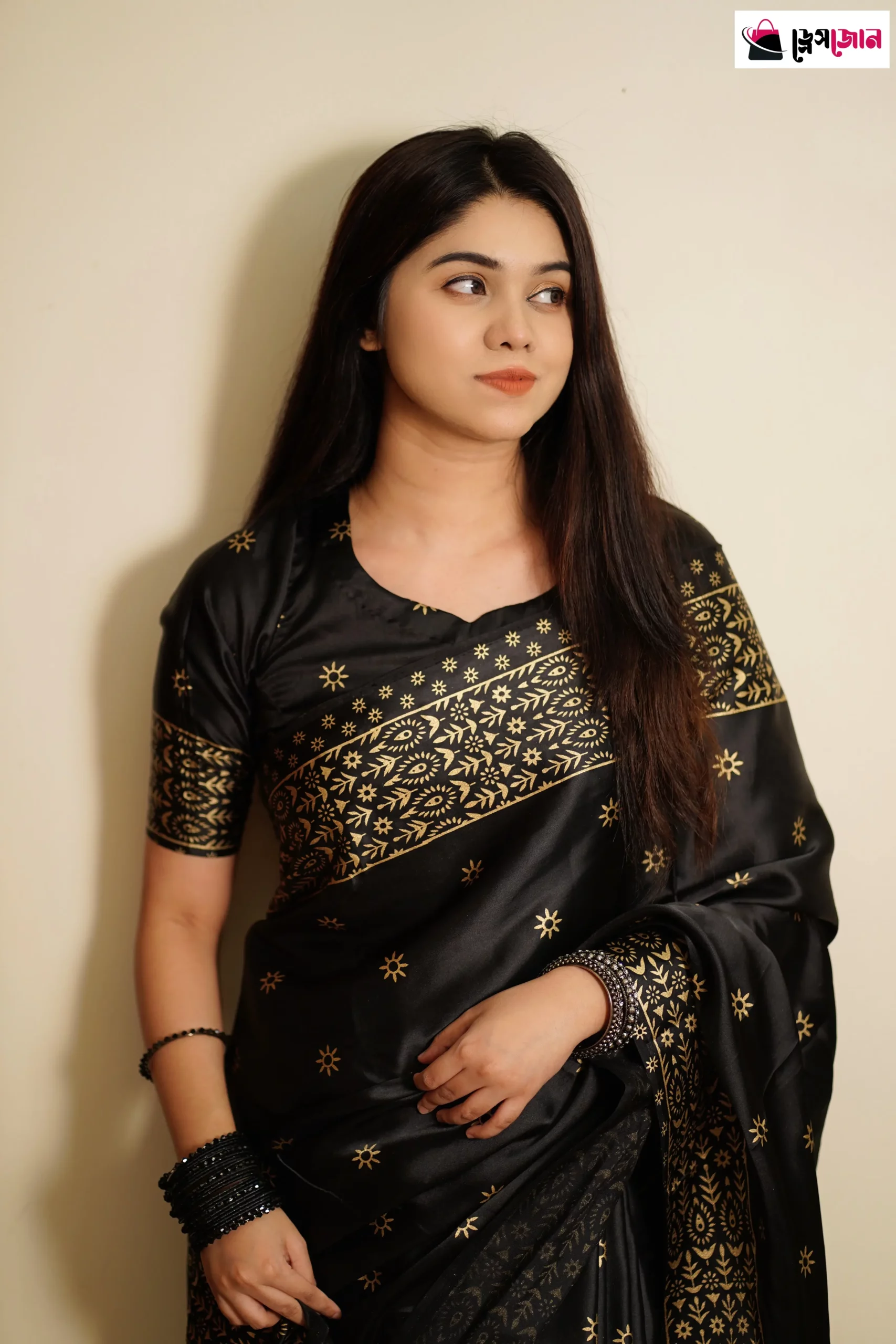 প্রিমিয়াম জাপানি সিল্ক শাড়ী + ম্যাচিং ব্লাউজ পিস ব্লাক কালার